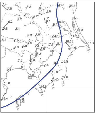 次に石廊崎についてみます。22時~23時にかけて、風向が東北東から南東へ急変し、同時に気温もこの1時間で約2℃上昇しています。これらの変化から、地上の温暖前線は21時以降の22時~23時に通過したと考えられます。したがって、石廊崎も「8日21時においても地上の温暖前線が通過していない」と判断されます。