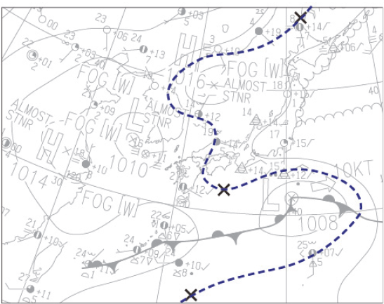 通常、地上天気図の等圧線は4 hPa間隔(例えば1012 hPaや1016 hPaなど)で描かれますが、気圧の尾根(高気圧の張り出し)や谷の位置を明瞭にするため、中間の1014 hPaの等圧線を補助的に描き加えます。指示された3点X(北海道の北方海上、四国の南海上、及び日本の遥か南の海上)を通る一本の破線として1014 hPa線を引くことで、高気圧の尾根の形状がはっきり示されます。実際、この1014 hPa補助線は、日本付近では北海道の北の高気圧から太平洋高気圧の縁にかけて南西–北東方向に延びる尾根を示し、四国沖から南方海上にかけて高気圧の張り出しが存在することが分かります。