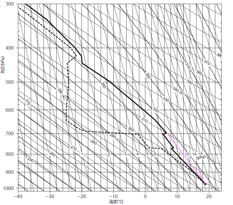一方、名瀬では下層の雲も報告されています。その下層雲は「名瀬の視界内の900 hPaより低い高度の空気塊が上昇したことで発生」したとの条件より、900 hPa以下から持ち上げられた空気がどこで凝結したかを考えます。エマグラム上で900 hPa(約800 m)付近の空気塊の持ち上げを追うと、約700 hPa付近で温度・露点が一致し飽和に達しています。この高度が下層雲の雲頂高度に相当します。すなわち、下層雲は大気下層からの上昇によって700 hPa(約3 km前後)の高さまで発達しており、その雲頂が約700 hPa付近と求められます。