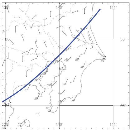 作図にあたっては、試験問題の指示に注意します。具体的には「シアーラインは枠線まで延ばす」「海岸から10km以上離れた地点には描かない」といった決まりがありました。まず変化の目安となる地点をいくつか赤線の短線でマーキングし、それらをなめらかに繋ぐことで模範解答図のようなシアーラインが完成します。②シアーラインを挟む両側の風向・風速の特徴を述べます。問題文でも「南東側・北西側」という言葉が与えられていましたので、それに沿って書き分けます。シアーラインの南東側では主に南西の風が吹いており、風速は反対側に比べて相対的に強いことが観測されています。一方、シアーラインの北西側では風向は北よりの風となっており、風速は南東側よりも相対的に弱い状態です。これらをまとめて「シアーラインの南東側は南西の風で相対的に強く、北西側は北よりの風で相対的に弱い。」と記述すれば解答となります。この記述は「どこで(シアーライン南東・北西側)・何が(風向と風速がどうなっているか)・どの程度(相対的に強い/弱い)」を盛り込んだ3点セットになっています。