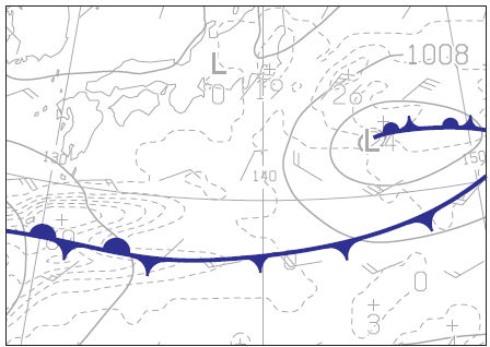 日本の東海上に中心気圧998 hPaの温帯低気圧があり、その低気圧に伴う寒冷前線が南西方向に伸びていました。この寒冷前線に連なる形で、西に延びる前線帯があります。850 hPa面の等相当温位線を見ると、高相当温位空気と低相当温位空気の強い境界(集中帯)の南縁に沿って明瞭な風向の変化(風のシア)が見られます。この線に沿って停滞前線を解析できます。問題文にも「低気圧に伴う寒冷前線とつながって西に延びる停滞前線」と記載されていることから、低気圧の寒冷前線の先端(東端)と停滞前線の東端が接続する形になります。具体的には、低気圧本体から南西に伸びる部分は寒冷前線、それに続いてさらに西へ延びる部分が停滞前線と判断できます。
