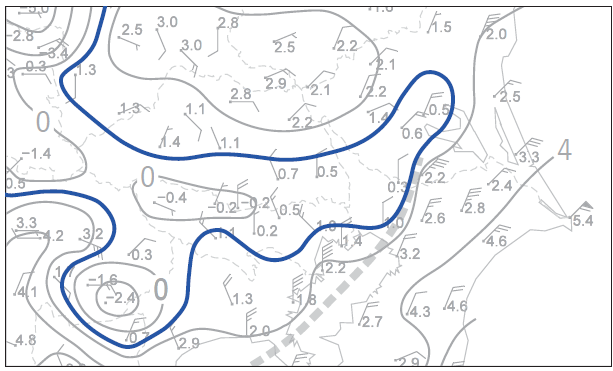 関東南部では、22日夕方にかけて北部から寒気が流入し、内陸部では0℃前後まで気温が下がっていました。海沿い(房総半島南部など)はやや高め(3~5℃程度)でしたので、1℃の等温線は内陸の冷気域と沿岸の暖気域の境目付近を南北に走る形になります。図12では、例えば埼玉・東京北部で0~1℃、東京南部~神奈川東部で2~3℃といった分布だったと推測され、1℃線はその中間を通るよう描くことになります。