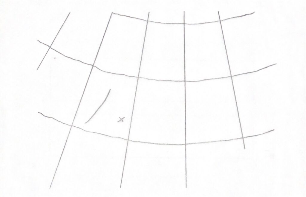 地上低気圧と上空500hPaトラフとの位置関係については、図1(地上天気図)と図3(上)(500hPa高度場)を重ね合わせて測定します。試験当時、500hPaのトラフは地上低気圧の西に位置しており、その最近距離は約400 kmと算出され、方位は西北西となりました。距離は緯度線の長さ(北緯30〜40°で子午線1度≈1100km)から比例計算で求め、コンパスを用いて精度良く測定します。方位は地図上でおおよそ45°傾いていたため北西と見間違えやすいですが、緯線が左上がりである点に注意し西北西と判断します。