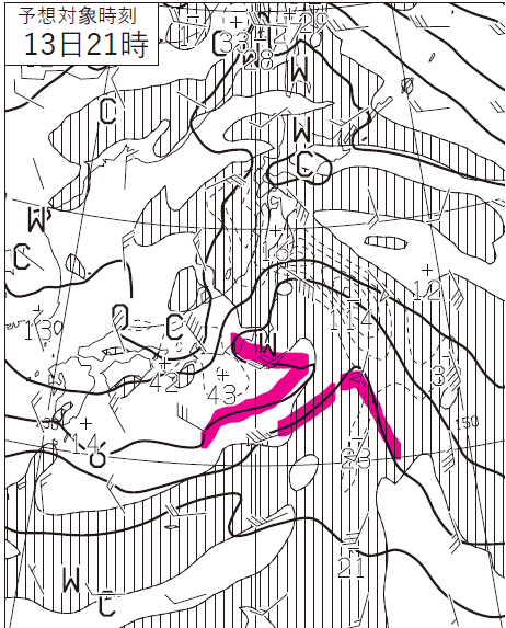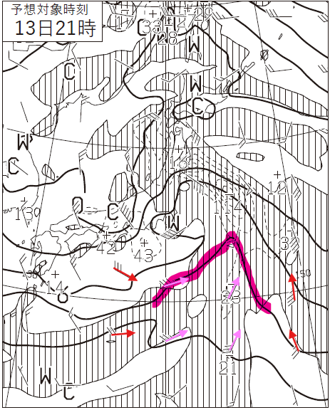 等温線集中帯の南縁および風のシアーにより前線位置を推定します。