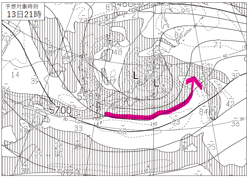 24〜36時間後(13日9時から13日21時)になると、500hPaトラフは進行方向をやや北寄りの東北東進に変え、さらに速度を増して地上低気圧に追いつくように移動しました。実際に13日21時には上空トラフの位置が地上低気圧に追いつき重なるような配置になっています。このことから、「トラフは東北東へ進み速度を上げて低気圧に追いつく」という表現になります。以上の記述は、この種の問題で頻出の定型表現であり、過去問演習で慣れておくとスムーズに書けるでしょう。