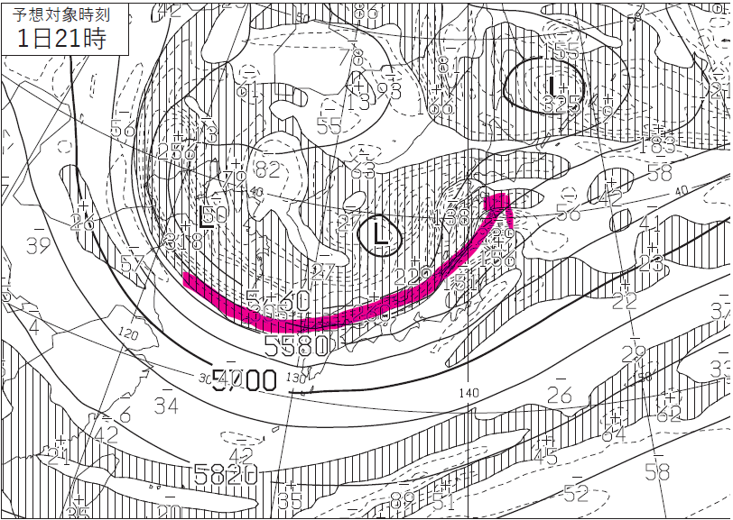 理由としては、5520 mの等高度線が500hPa正渦度域の南縁(渦度=0の線)とほぼ一致し、強風帯を示唆しているためです。解答例でも「500hPa面の正渦度域の南縁(渦度ゼロの等値線)に最も近いため」と記述されています。同様の問題では、対流圏上層のジェットコア付近では等高度線が屈曲・集中しやすいこと、また正渦度帯の南端やトラフの南側でジェットが吹くことを知識として持っておくと、判断の根拠になります。