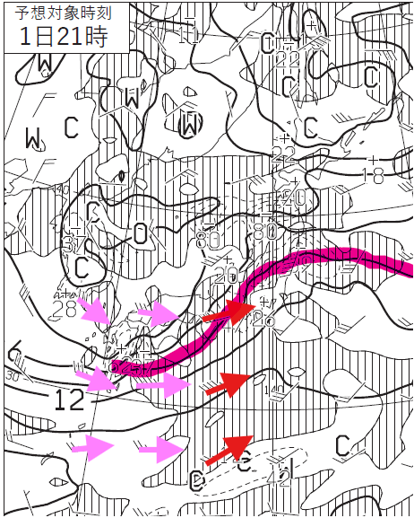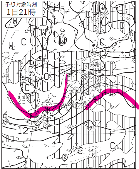 等温線集中帯の南縁および風のシアーにより前線位置を推定します。風のシアはやや不明瞭ですが南向き成分が生じたところを境とします。