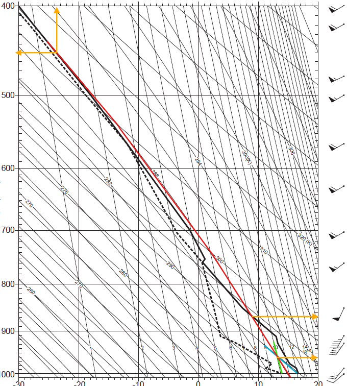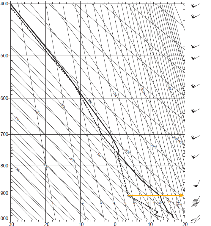 解答は10%刻みですので50%ということになります。高度:910 hPa、相対湿度:50%と答えるのが模範解答です。もし850 hPa付近と判断した場合でも、許容範囲としては誤差10hPaなのであまり差はありません。大事なのは下層と上層の間に乾燥層が存在することを読み取る点です。館野では自由対流高度の直上、850~700 hPa付近に乾燥層があり、これが後述の現象に関与しています。
