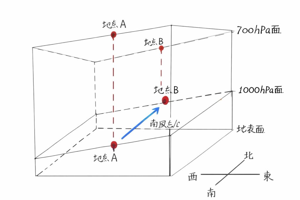 - (c) 暖気移流の大きさの比較について:地点Aと地点Bで同じ。 温度移流の強さは、水平温度勾配の大きさと、等温線に直交する風成分の大きさで決まります。両地点では温度勾配自体は等しく、1000 hPa面では等温線に直交する南風成分(5 m/s)が同じです。また700 hPa面では地点Aは風速が大きいものの風向の南成分が小さく、地点Bは風速が小さい代わりに南成分が大きくなるため、等温線に直角な風成分の大きさは両地点で等しくなります。その結果、暖気移流の強度(南から北への暖気運搬量)は両地点で同程度と考えられます。