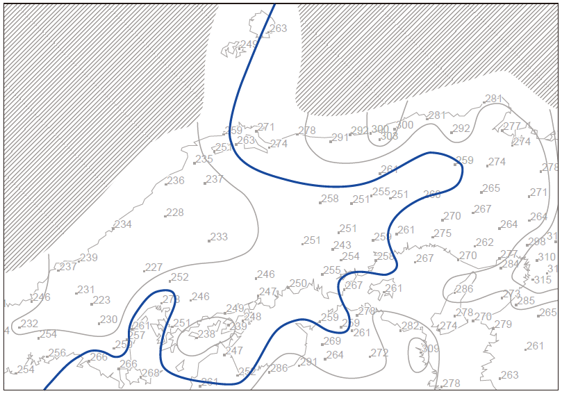 図10上図は9日9時(実況)の地上気温分布を示しています。各地点の気温は0.1℃単位まで示されており(例:「258」は25.8℃、「261」は26.1℃を意味します)、高度300m未満の観測点のみ表示されています。26℃の等温線を引くには、これらの観測値の中から25.5~26.5℃程度の地点を結ぶ必要があります。具体的には、気温が26℃以上の地点と26℃未満の地点の境界線を見極め、その間を滑らかに繋ぎます。まず、図全体で26℃を超える暖域と下回る寒域を把握します。図を見ると、山陰地方の東寄り(松江付近)では気温が26℃台後半(例:松江付近で「263」は26.3℃)となっており、逆に中国山地を挟んだ西側(島根県西部~山口県北部沿岸など)では25℃台前半(例:「252」は25.2℃)の地点があります。また九州北部から瀬戸内海西部にかけても25~26℃前後の値が点在しています。
