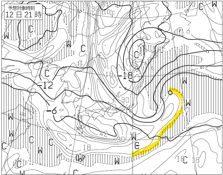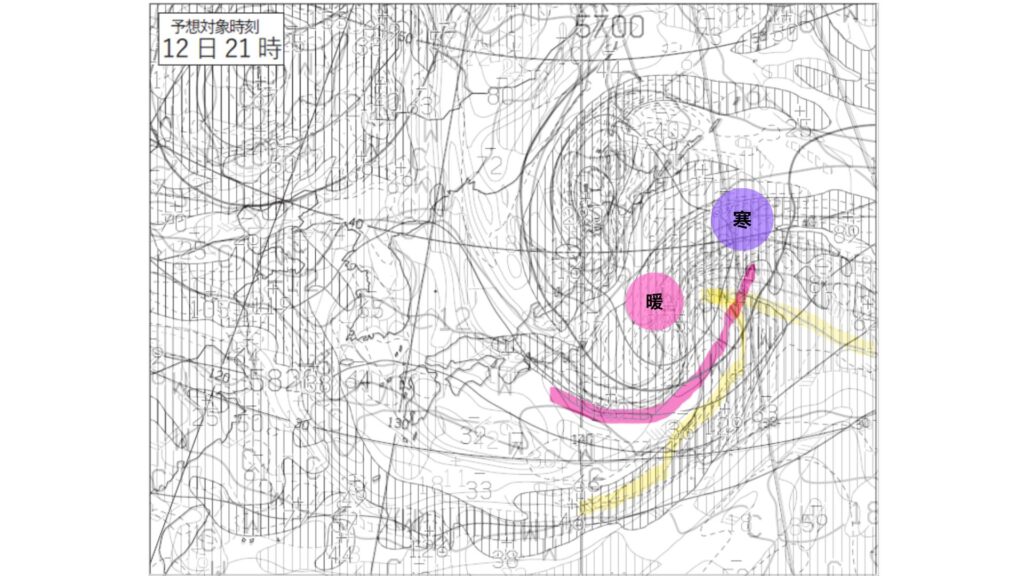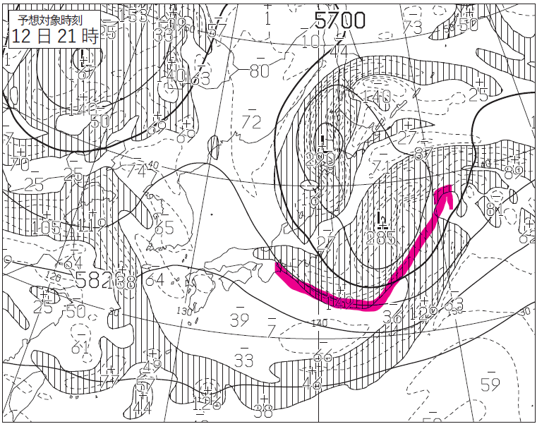 ①12日9時の500hPa高度場では、該当低気圧に対応して2本のトラフAおよびBが解析されます。等高度線の強い屈曲と渦度極大域に沿って赤線で滑らかに描画されたもので、片方は低気圧の西側上空から南西方向へ伸びるトラフA、もう一つは低気圧の北東側上空に位置する短波トラフBとして示されています