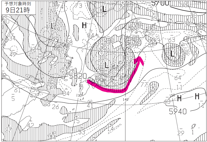 以上より地上天気図の風のシアに配慮しながら作図すると模範解答になります