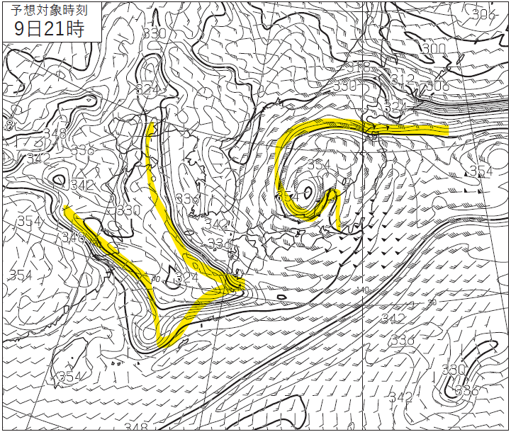 ① 図9によると、九州の西から関東の東にかけて広がる広範囲な乾燥空気の領域が確認できます。この領域では上空の湿数(湿潤度を表す指標)が大きく、すなわち空気が非常に乾燥しています。700hPa高度の鉛直流を図8で確認すると、この乾燥空気域に対応する部分ではほとんど上昇流がなく、むしろ下降流が卓越しています。換言すれば、九州西~関東東の広い範囲で700hPaの鉛直風は下向き(負の値)となっており、積極的な対流活動が抑制された subsidence 領域になっているわけです。一方、同じ領域の850hPa面の相当温位分布(図9下段など)を見ると、相当温位が周囲に比べ低い空気が広がっていることがわかります。相当温位は大気の持つ熱と水蒸気量を示す指標で、値が低いほど冷たく乾燥した空気を意味します。従って九州西~関東東にかけての下降流域は、850hPaでは相対的に低相当温位の乾燥空気塊から成るといえます。これは台風の南西側~西側に位置する乾燥空気の流入を示唆するもので、温帯低気圧化の典型的な兆候の一つです。