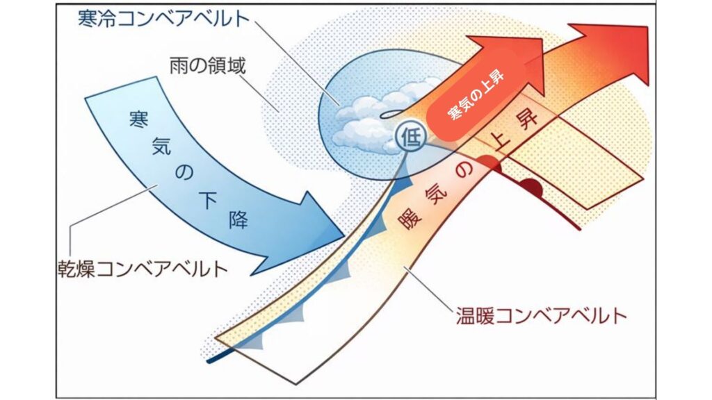 ⇒低気圧の周りで、空気がベルトコンベアのように まとまった流れ を作る現象。低気圧の発達・雲の分布・降水帯の位置がこの流れで決まります。